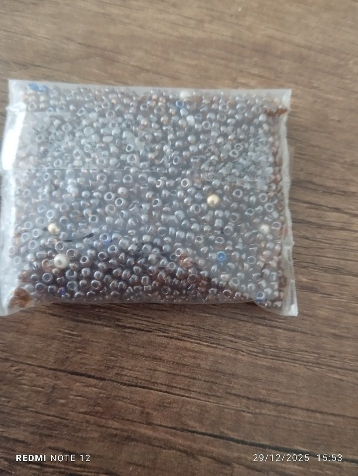 Bej ve gri renkte için küçük boncuklar, şeffaf poşette.
