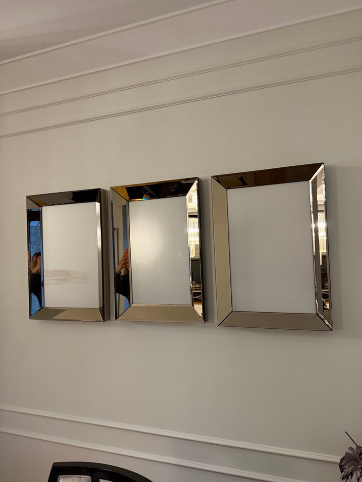 Bej ve gri renkli çerçevelere sahip, modern tasarımlı üçlü dikdörtgen ayna seti. 3 lu ayna seti eni 45 boy 60 cm