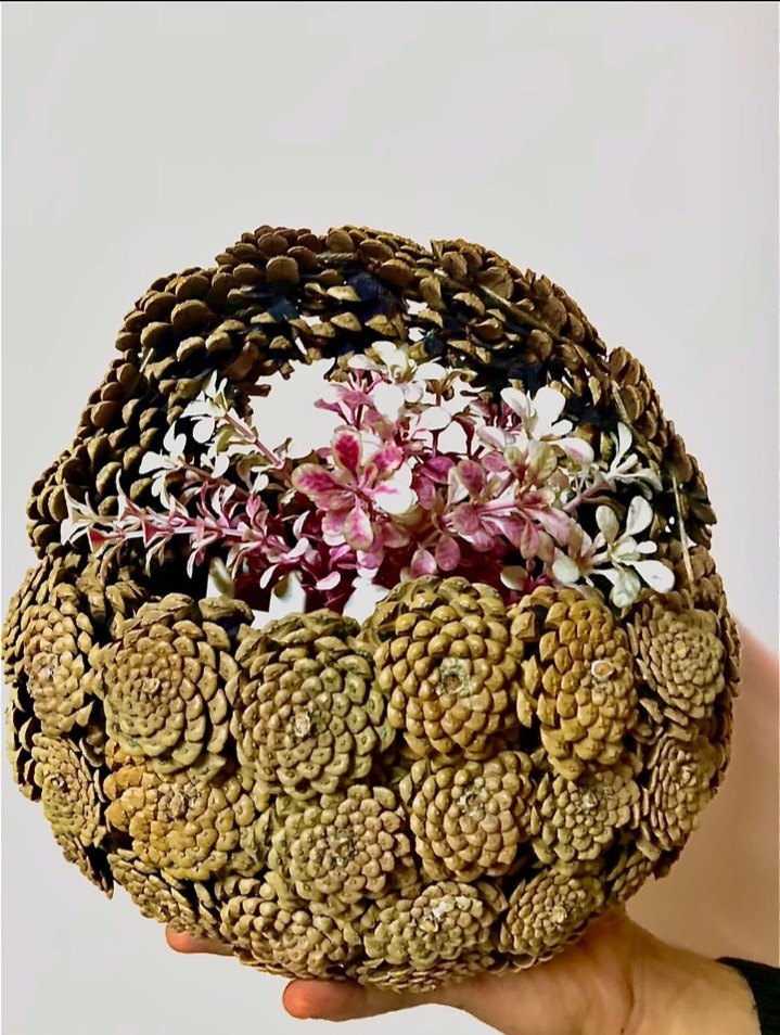 Bej ve gri tonlarda doğal malzemelerden yapılmış, dekoratif sepet. Marka değildir. Kendim el emeğimle yaptım.