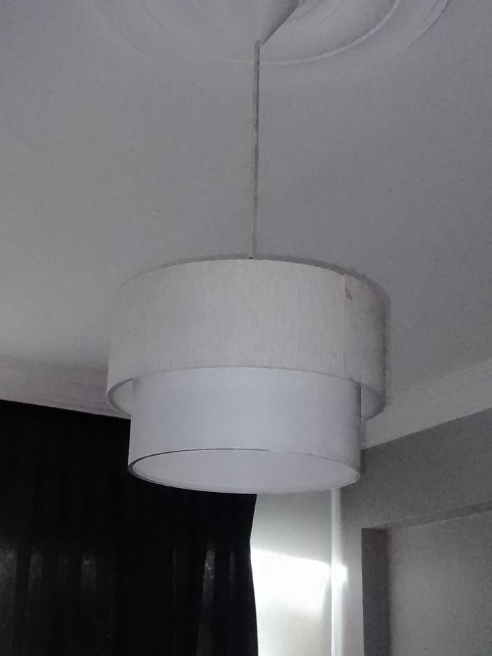 Bej ve gri renklerde çift katmanlı kumaş sarkıt avize, ortam aydınlatması için uygundur. yatak başı abajuruyla birlikte satın almıştık onlari ayrı koydum satmaya hepsini toptan isteyene bir fiyat cikartirim kirlenen yıpranan bir ürün değil