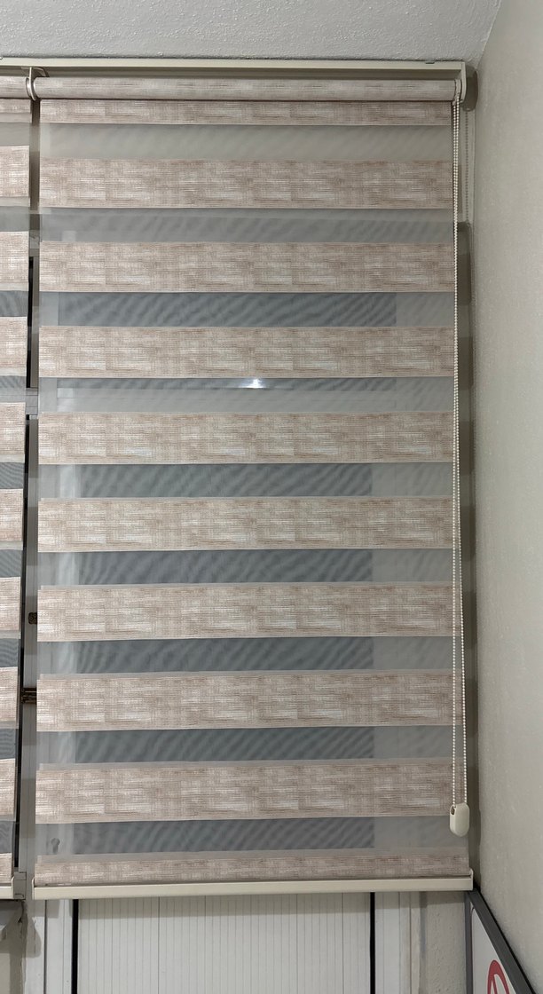 Bej ve gri çizgili kumaştan oluşan bu modern stor perde, ayarlanabilir ışık kontrolü sağlar ve çekme ipi mekanizmasına sahiptir. Modern dekorasyonlara uygundur.