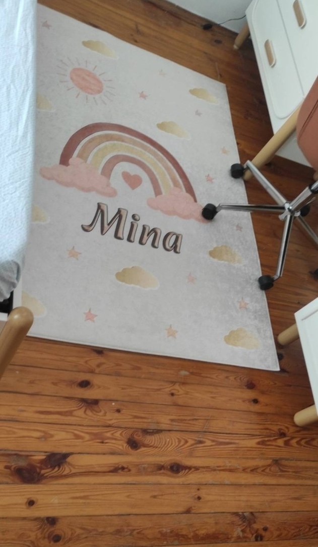 Bej ve gri renklerde, üzerinde gökkuşağı ve "Mina" yazısı bulunan çocuk halısı. Yumuşak dokulu, çocuk odaları için uygundur. özel yapım küçük geldiği için odaya tekrar yaptırdım hiç kullanılmadı sıfır