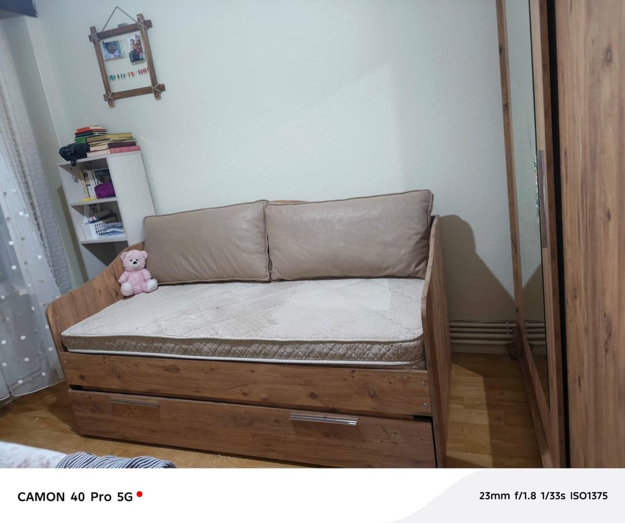 Ahşap çerçeveli, altında çekmeceli bej ve gri çocuk yatağı, rahat minderler ve yumuşak yatak içerir. ️