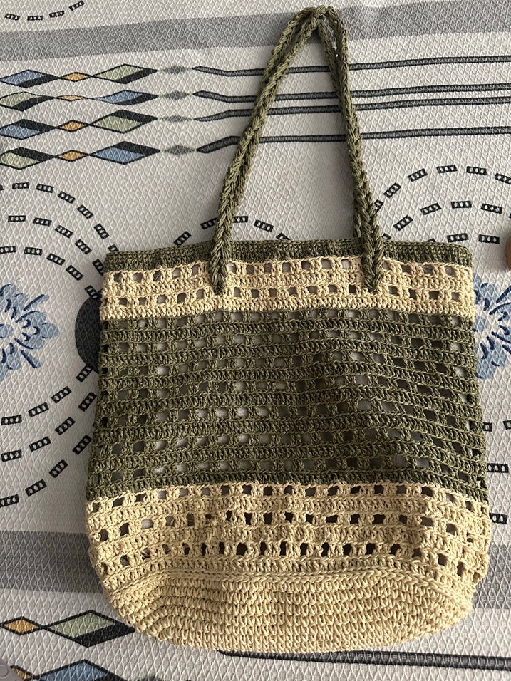 Bej ve gri tonlarda dantel detaylı, örgü dokulu bohem tarzı kadın çantası, günlük kullanıma uygun.