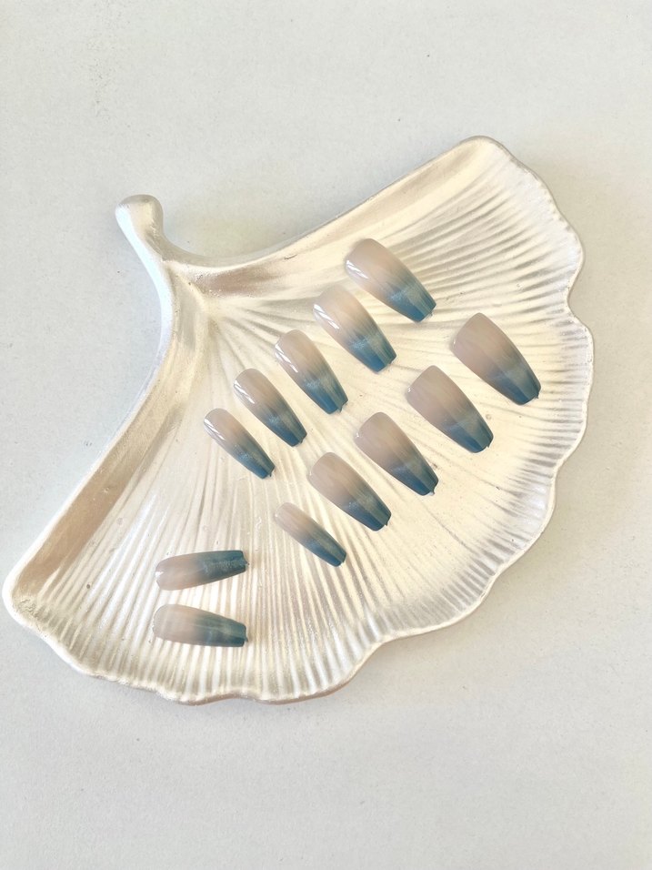 Bej ve gri degrade renklerde, 12 adet DIY tırnak süsü. Doğal ve şık görünüm sağlar.