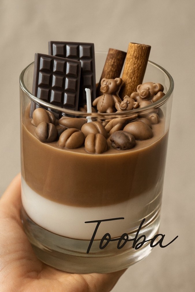Şeffaf camda bej ve gri detaylı dekoratif mum, küçük ayıcık figürleri, tarçın çubukları ve çikolata şekilleriyle sıcak bir görünüm sunar ️.