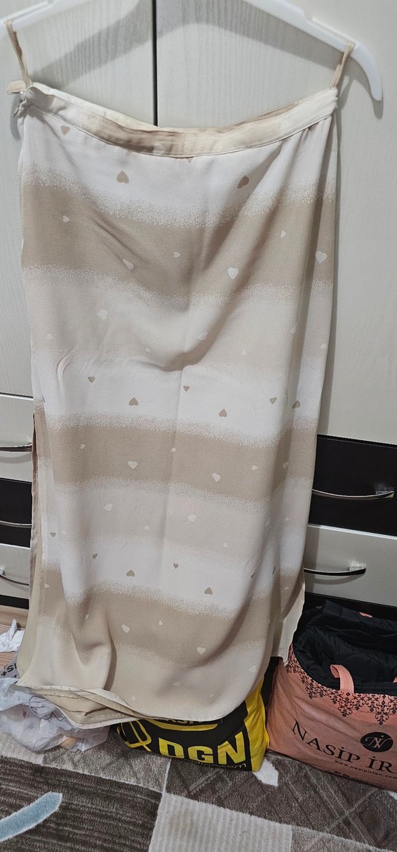 Yumuşak sentetik kumaştan yapılmış, bej ve gri tonlarda küçük kalp desenli, drapeli kadın etek Rahat ve bohem tarzda.