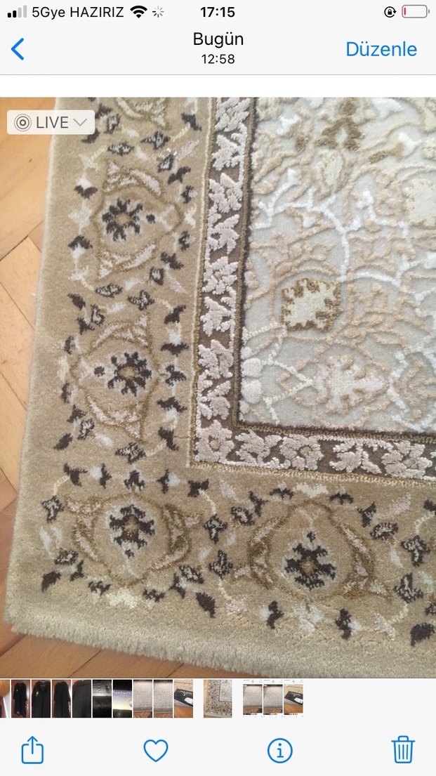 Bej zemin üzerine gri desenler ve çiçek motifleri bulunan klasik tarzda halı. "LIVE" yazısı yüzeyde yer alıyor.