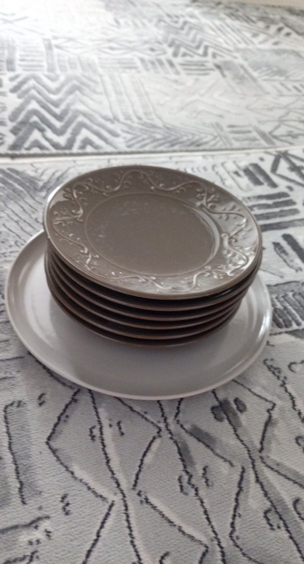 Desenli kenarlarıyla bej ve gri renklerde dekoratif tabak seti. Tatlı tabak sunumları için uygun. ️