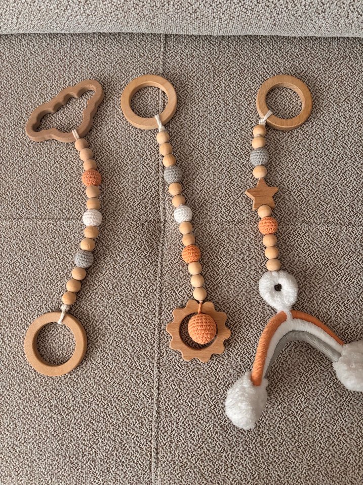 Ahşap boncuklar ve yumuşak tığ işi detaylarla bej ve gri renkli üç diş kaşıyıcı ve çıngırak seti.