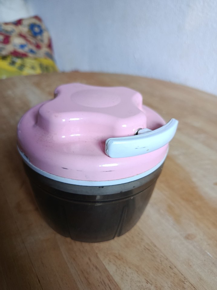 Bej ve gri renklerde, içinde keskin bıçak bulunan doğrayıcı kabı. Blender tabanına kolayca takılır.