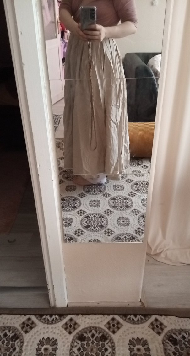 Bej ve gri tonlarda, desen içermeyen, normcore tarzında pileli etek. utuleyemedim uZgunum ama prenses etek diye geçiyor. önden fermuarlı alt ve üst şeklinde.
