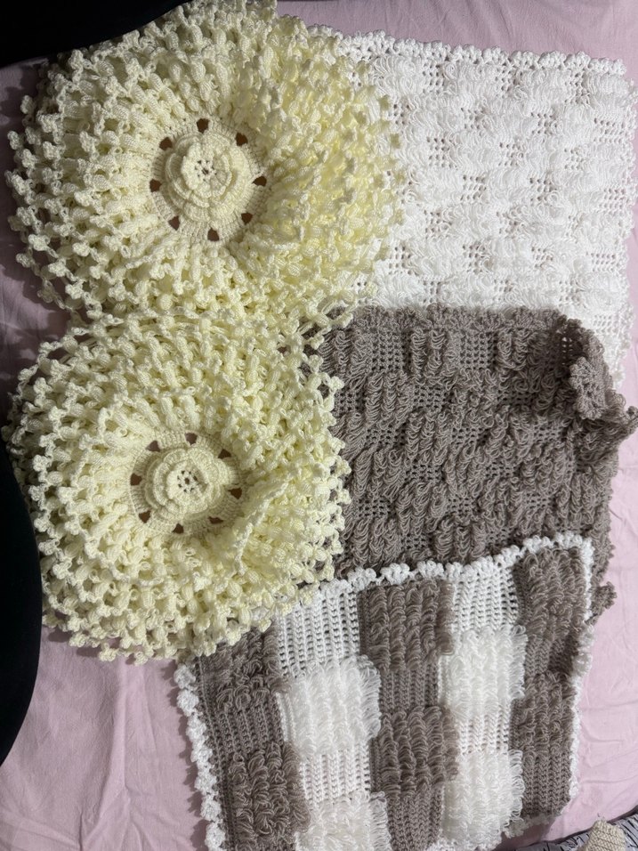Bej ve gri renklerde, yumuşak örgü dokusuna sahip el yapımı banyo süngerleri. Nazik cilt temizliği için uygundur.