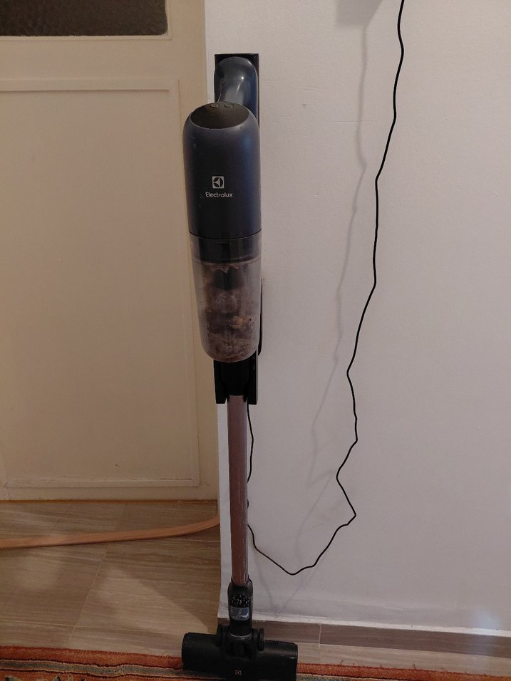 Bej ve gri renkte, kablosuz Electrolux süpürge. İnce tasarımlı, çıkarılabilir toz haznesi ve duvara monte şarj özelliği bulunur.