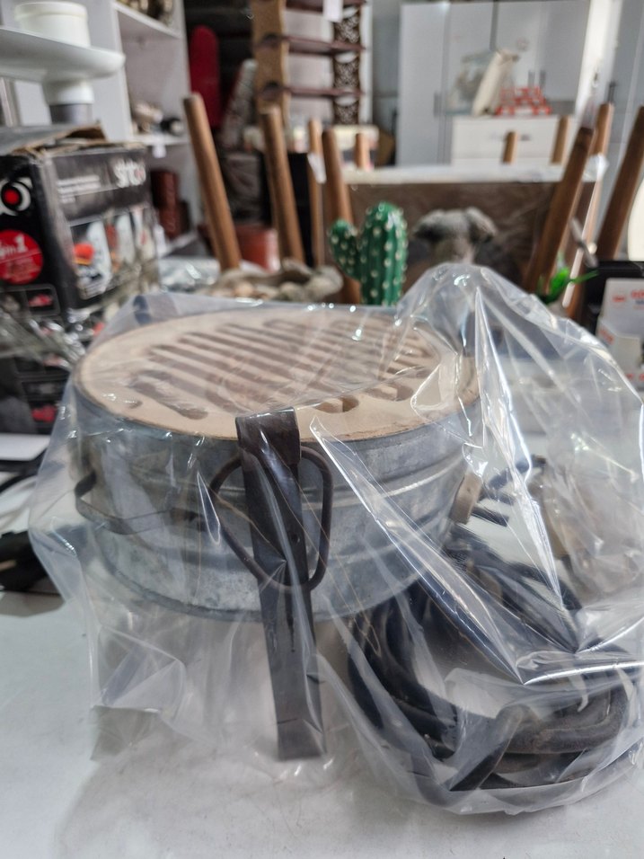 Bej gövde ve gri detaylara sahip küçük elektrikli ızgara, ahşap ızgara yüzeye sahip. sorunsuz çalışmaktadır.