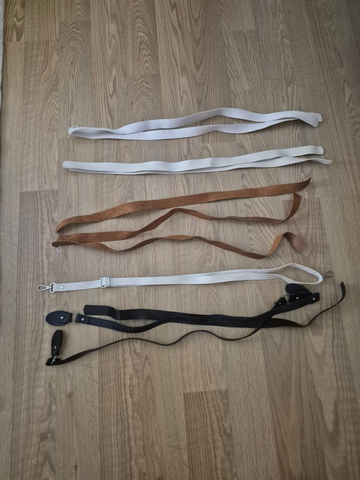 Bej ve gri renklerde, ayarlanabilir kayışlı ve metal klipsli vintage tarz erkek askıları seti.