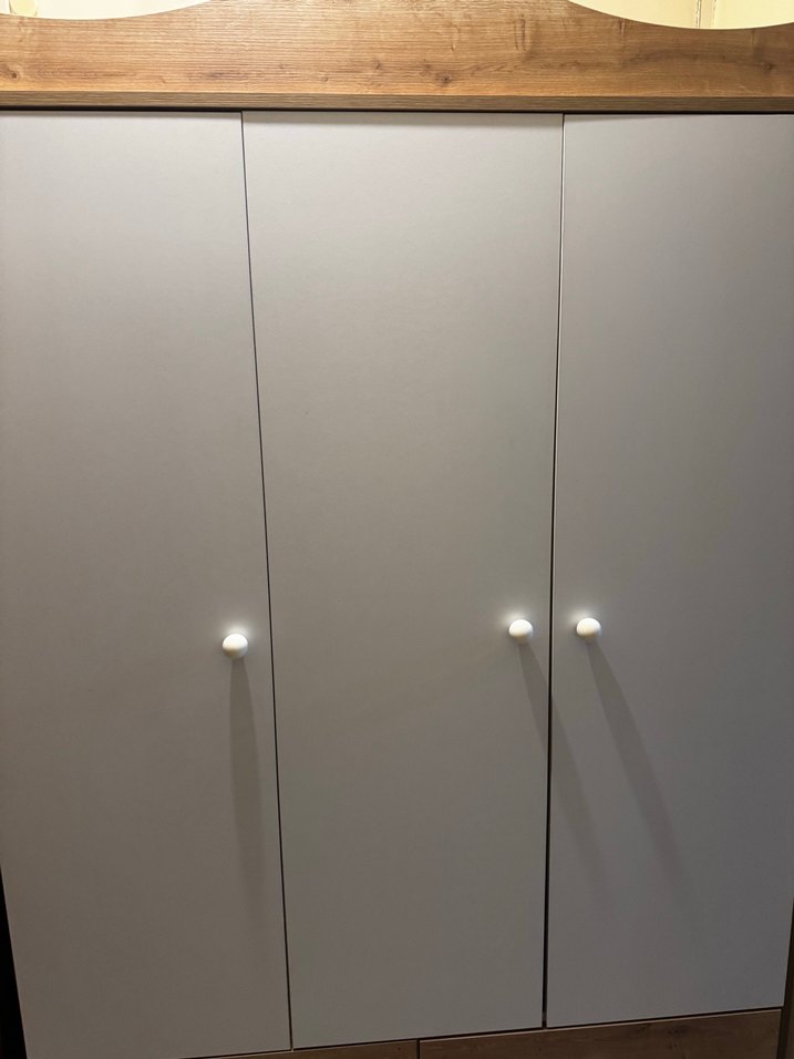 Üç kapılı, yuvarlak beyaz kulplu, bej ve gri tonlarda gardırobu, sade ve kullanışlı tasarım.