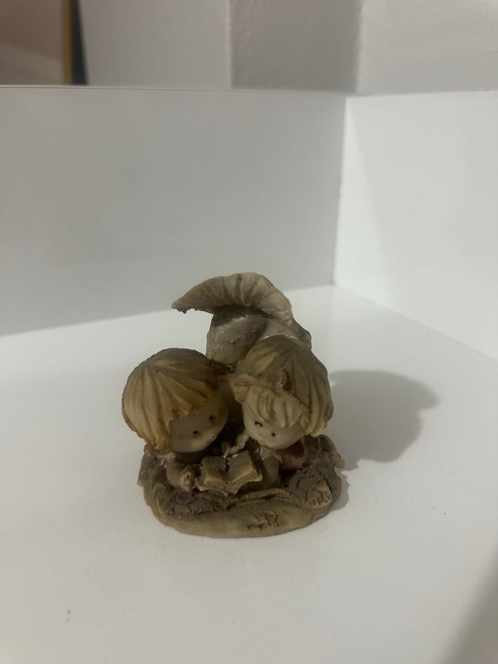 Bej ve gri renkte, iki çocuğun birlikte oturduğu detaylı dokulara sahip biblo. Çocuklar arasındaki samimi anı yansıtıyor.