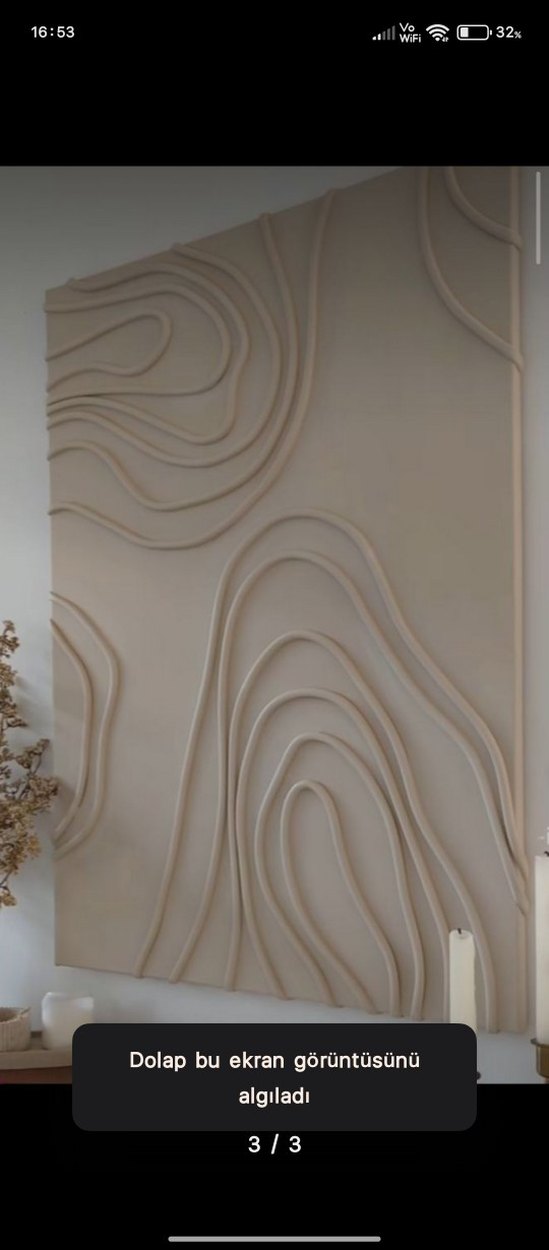 Bej renkte kabartmalı, akışkan çizgilerle soyut desen oluşturan gri tonlarda duvar tablosu. Duvara hafif derinlik katar.