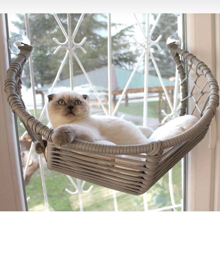 Bej ve gri renklerde, örgü malzemeden yapılmış, kediler için asılabilen rahat bir hamak.