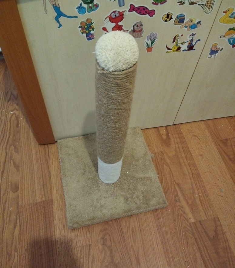 Bej ve gri renklerde, yumuşak üst kısmı olan kedi tırmalama direği, kedilerin tırnaklarını törpülemesi için uygundur.