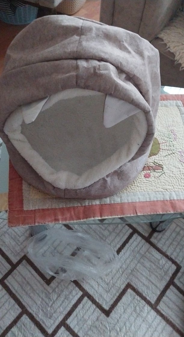 Yumuşak iç kısmı ve bej-gri dış yüzeyi ile kediler için rahat bir yatak.