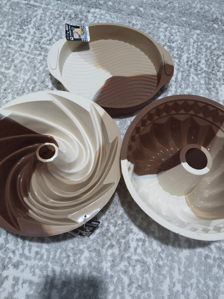 Farklı şekillerde bej ve gri kek kalıpları seti, çeşitli kekler için uygundur.