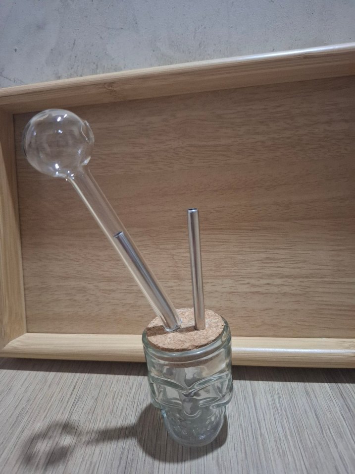 Bej mantar kapaklı, şeffaf cam gövdeli ve kafatası tasarımlı kesme gereçleri tutucu. Metal ve cam gereçleri sabit tutar.