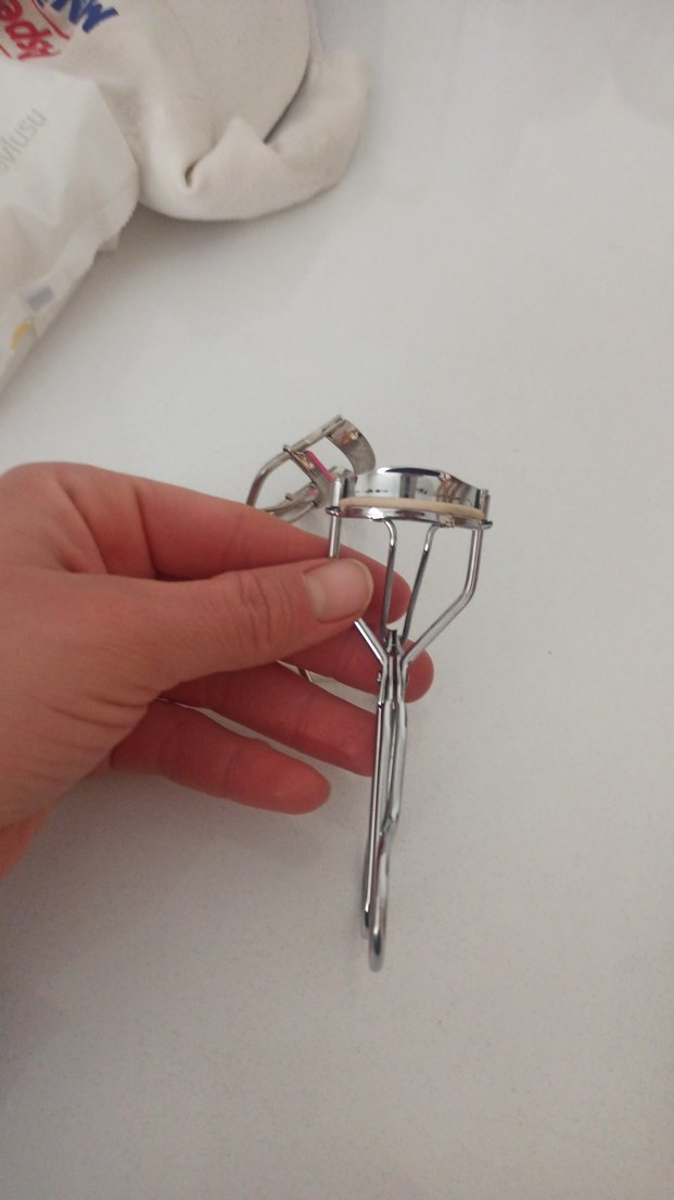 Bej ve gri renk detaylarına sahip metalik yapıda kirpik kıvırıcı, kirpiklerinizi kıvırmak için uygundur.