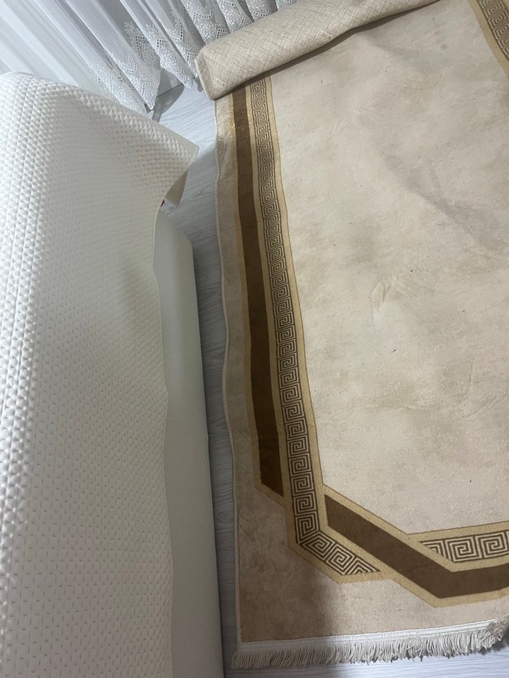 Bej ve gri tonlarında, klasik kenar desenine sahip yumuşak dokulu halı. Farklı mekanlara uyum sağlar ıkı adet fıuatıdır 2 tane 3 metre aynı model yolluk .