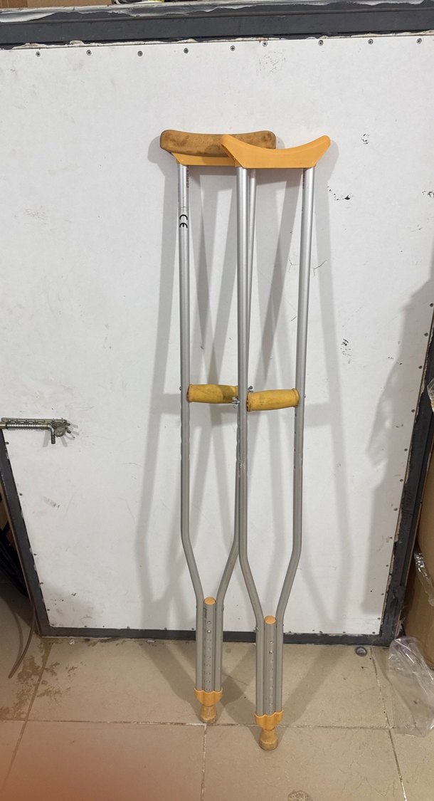 Bej ve gri renklerde, kol ve el destekli, ayarlanabilir yükseklikte koltuk değneği.