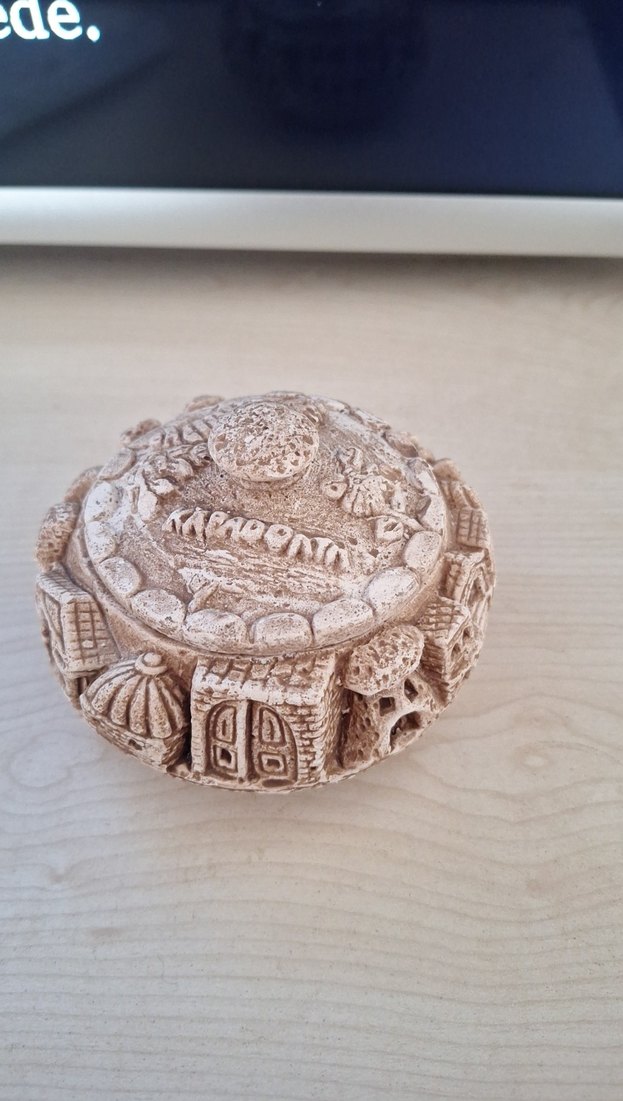 Bej ve gri tonlarında, taş görünümlü detaylara sahip küçük dekoratif biblo. ️