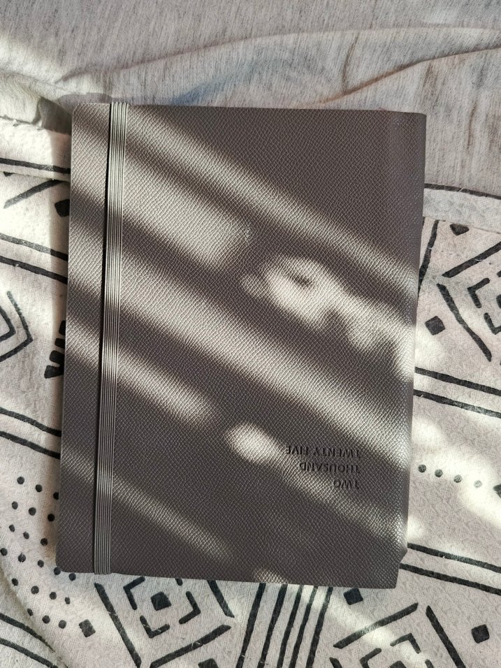 Gri dokulu kapaklı, kapanması için lastiği bulunan bej renkli Ajanda. Hiç kullanılmadı, herhangi bir kalem izi yok