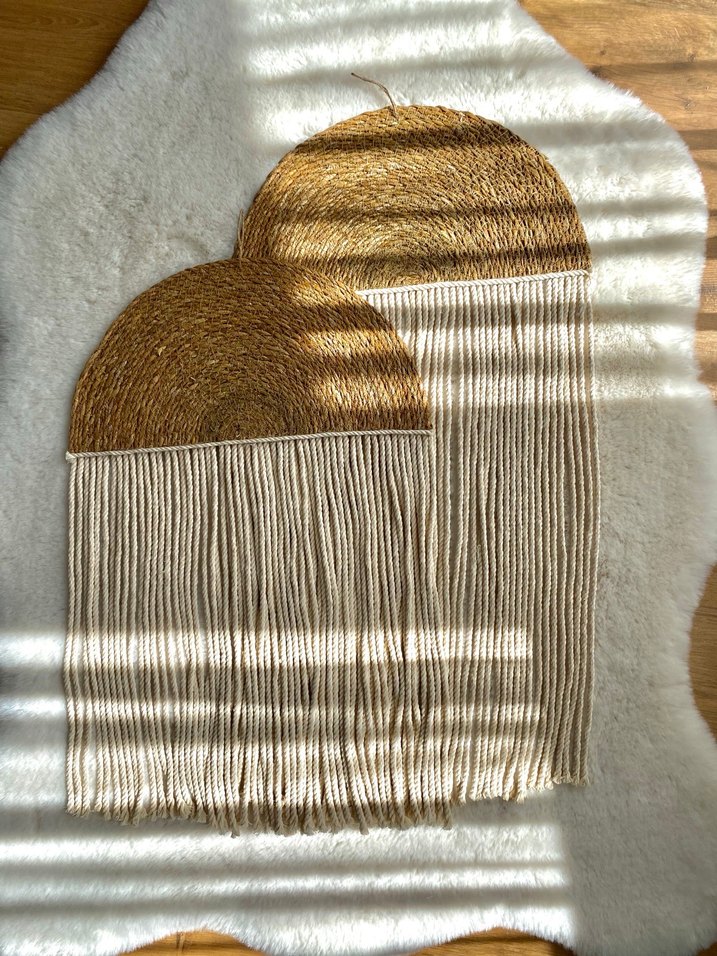 Bej ve gri tonlarda, doğal dokuma üst kısmı ve uzun püskülleriyle sıcak bir atmosfer katan duvar dekoru.