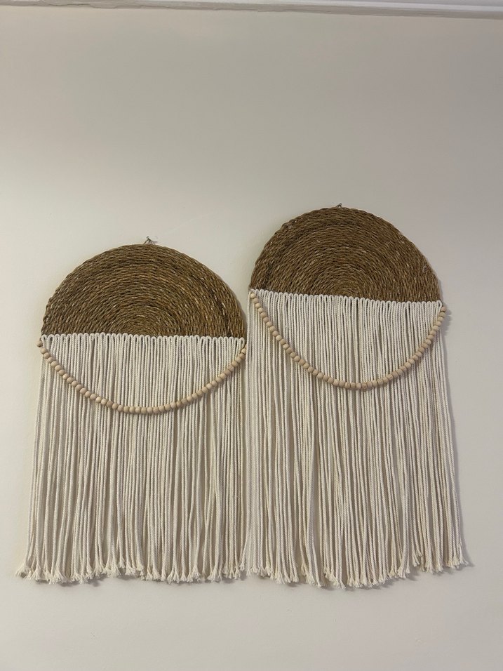 Bej ve gri renklerde, boncuk detaylı, yuvarlak tabanlı ve uzun püsküllü iki makrome duvar süsü seti. Tamamı el emeği olarak hazırlanmış bohem tarz duvar dekorlarıdır. Doğal hasır, pamuk ip ve ahşap boncuklar kullanılmıştır. Seri üretim değildir. • 2 adet dekor (set halinde satılmaktadır) • Bohem / naturel / minimalist dekorasyonlara çok yakışır • Salon, yatak odası, antre veya kafe dekoru için uygundur • Temiz, yeni ve kullanılmamıştır