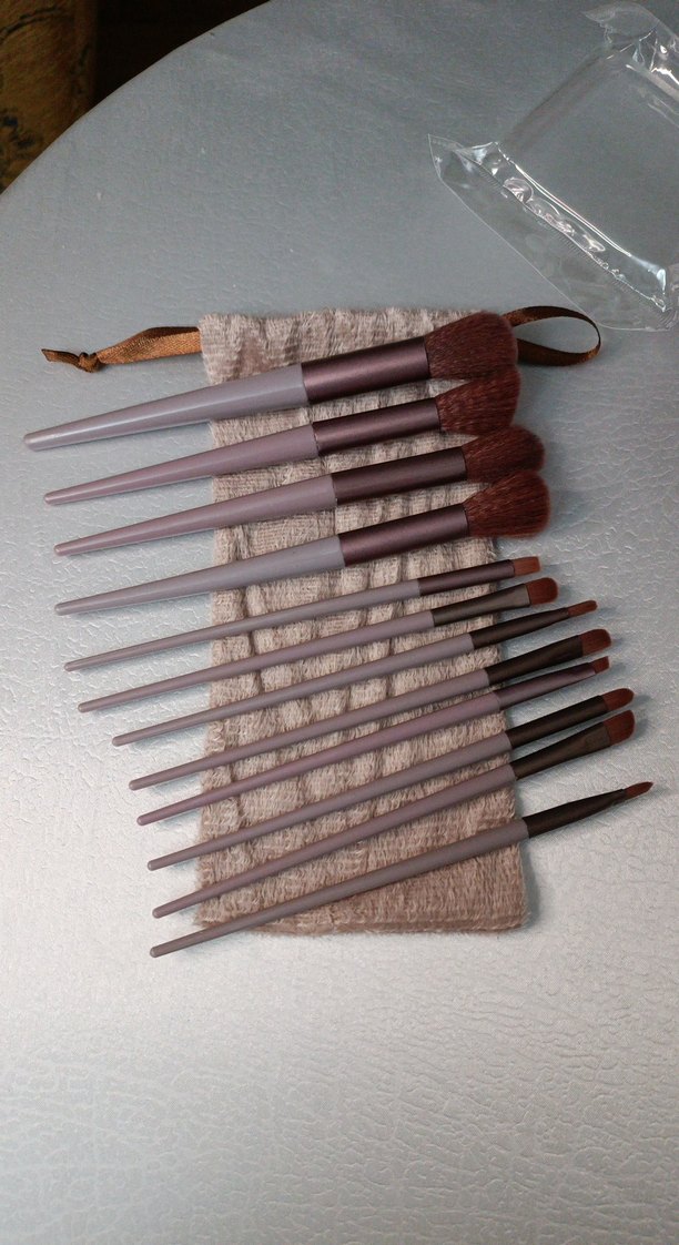Bej saplı ve gri detaylı, yumuşak kıllı çoklu makyaj fırçası seti ve bej kumaş taşıma kesesi. ️ tam set
