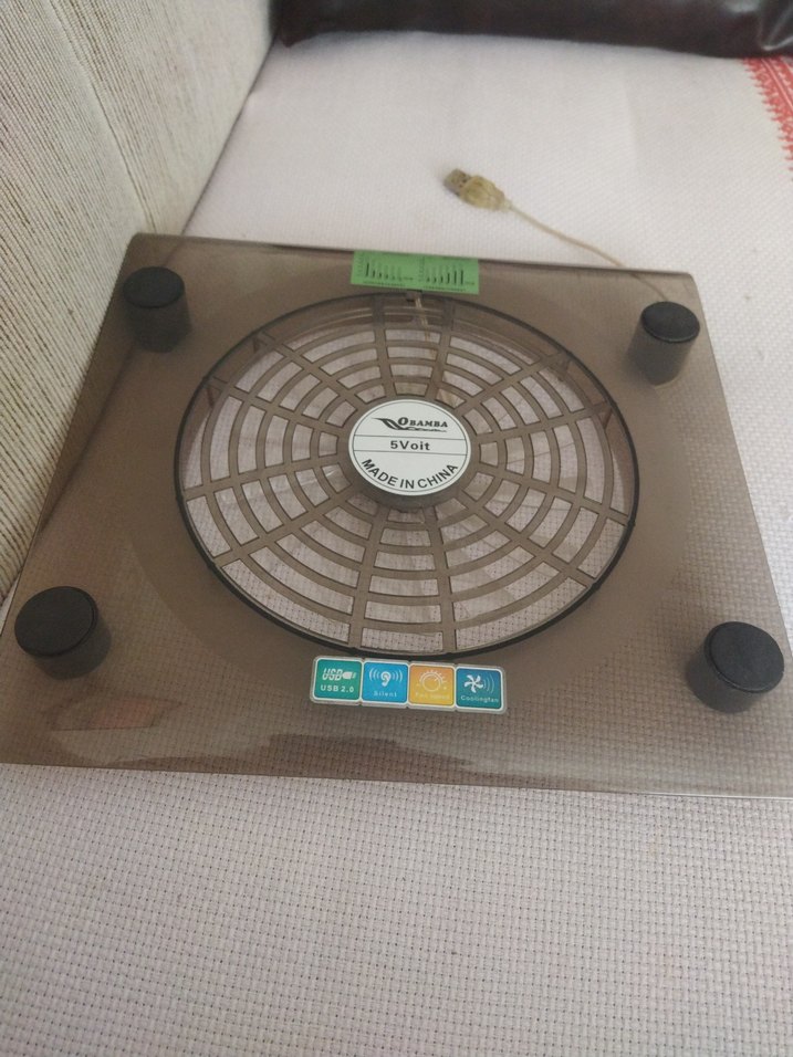 Bej ve gri renkte, USB bağlantılı masaüstü fan. Dört adet siyah kauçuk ayaklı ve 5 volt güçle çalışır. ️