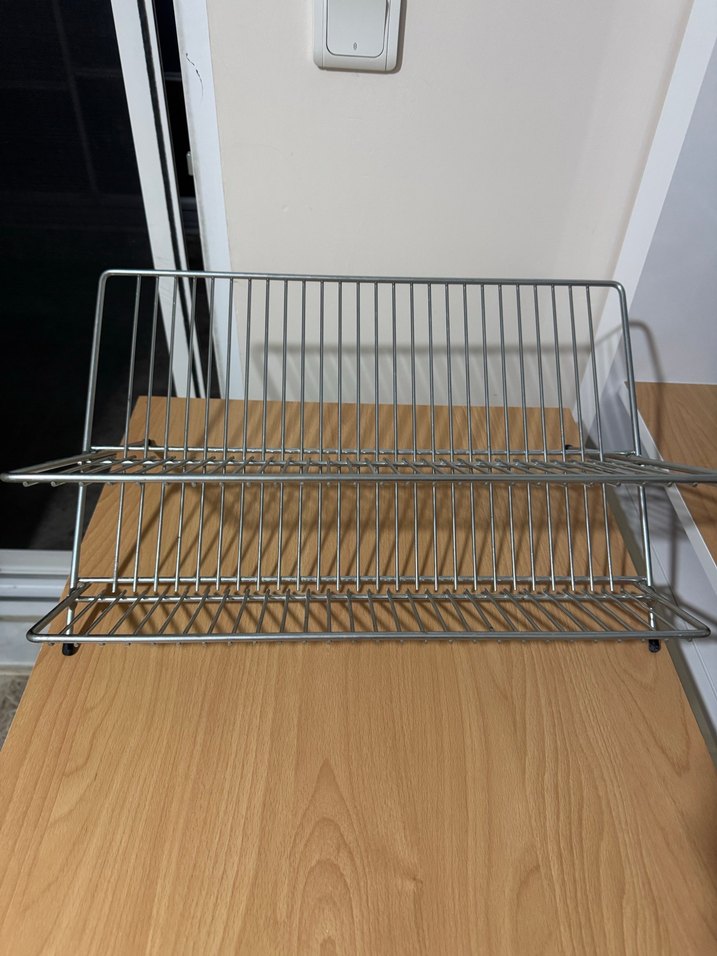 Bej ve gri renkte, iki katlı metal bulaşık kurutmalık. Tabak, kase ve çatal bıçaklar için kullanışlıdır.