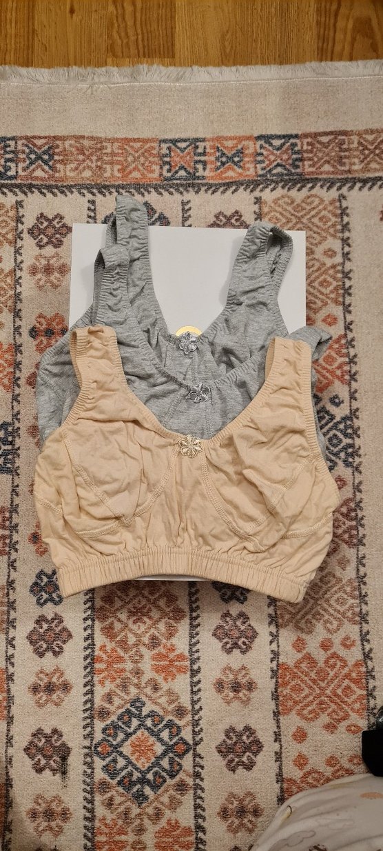 Bej ve gri renklerde, desen içermeyen, kısa kesim ve rahat sokak stili sütyenler, büzgülü askılarla konfor sağlar.