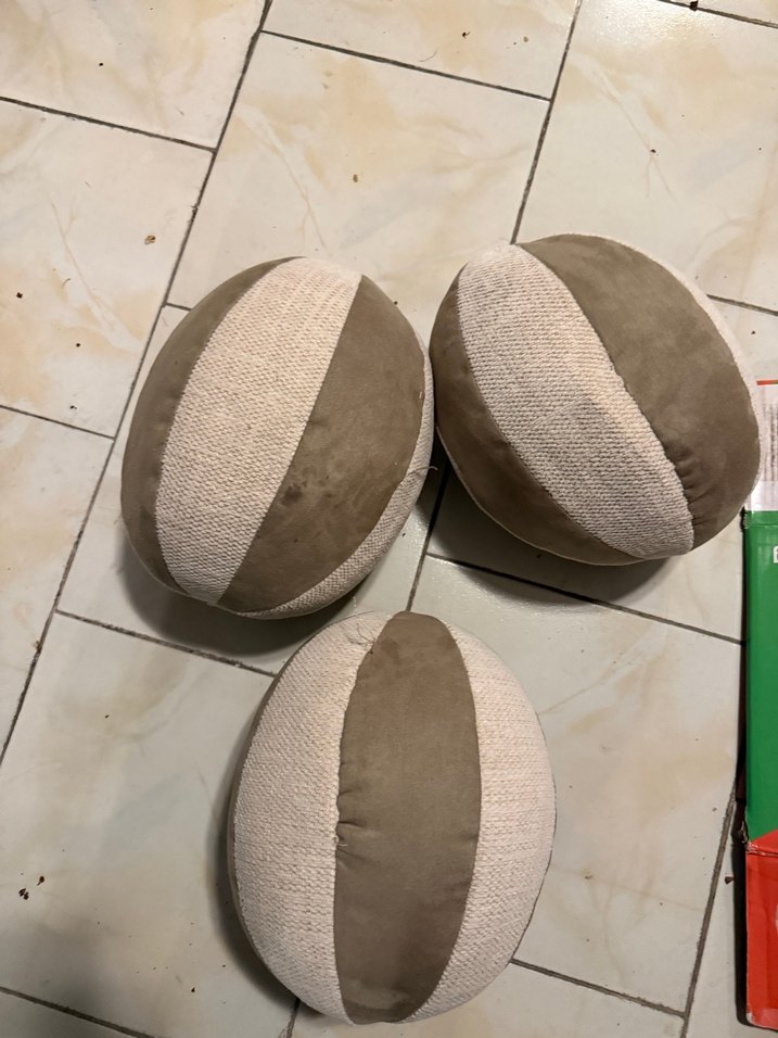Bej ve gri tonlarında, modern tarzda yuvarlak minderler. Yumuşak ve desen içermeyen kumaştan üretilmiştir, konfor ve şıklık sağlar. ️elips şeklinde kadıfemsı kumaş üç adet içi dolu gönderılecektır
