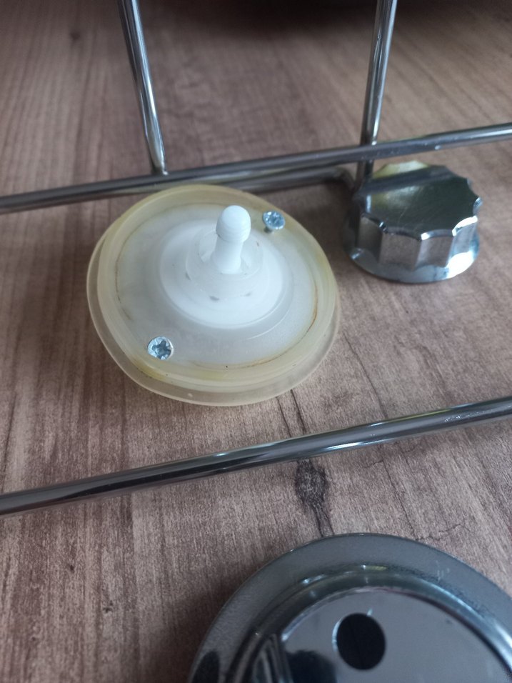 Metal ve plastik parçalar içeren bej ve gri mutfak aksesuarları, fonksiyonel kullanım için tasarlanmıştır.