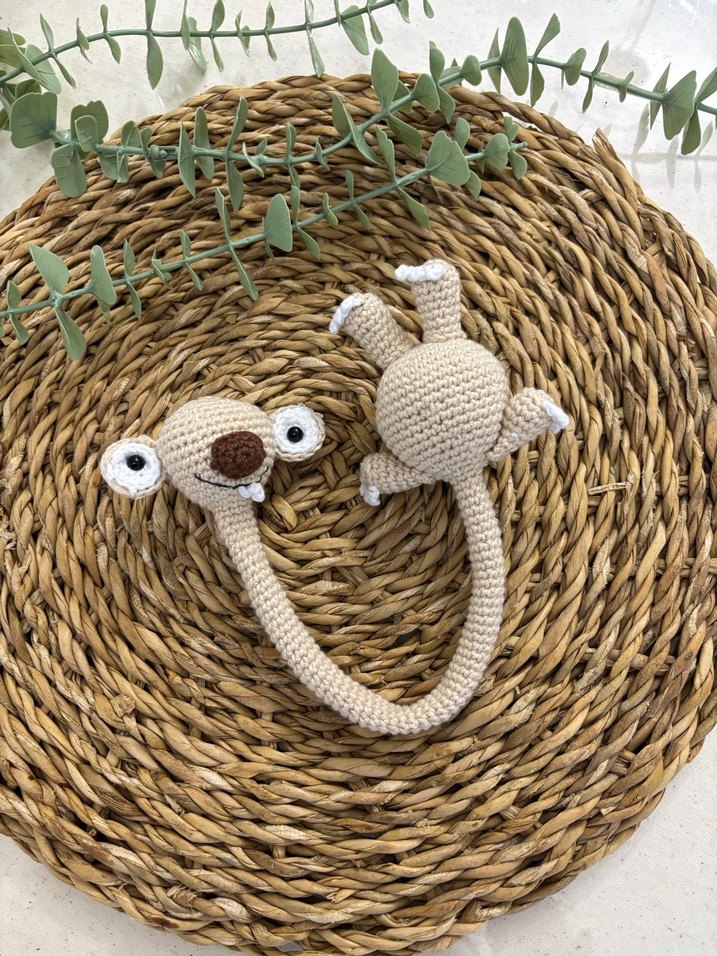 Yumuşak dokulu, bej ve gri renklerde, sevimli hayvan figürlü örgü peluş oyuncak. #sid