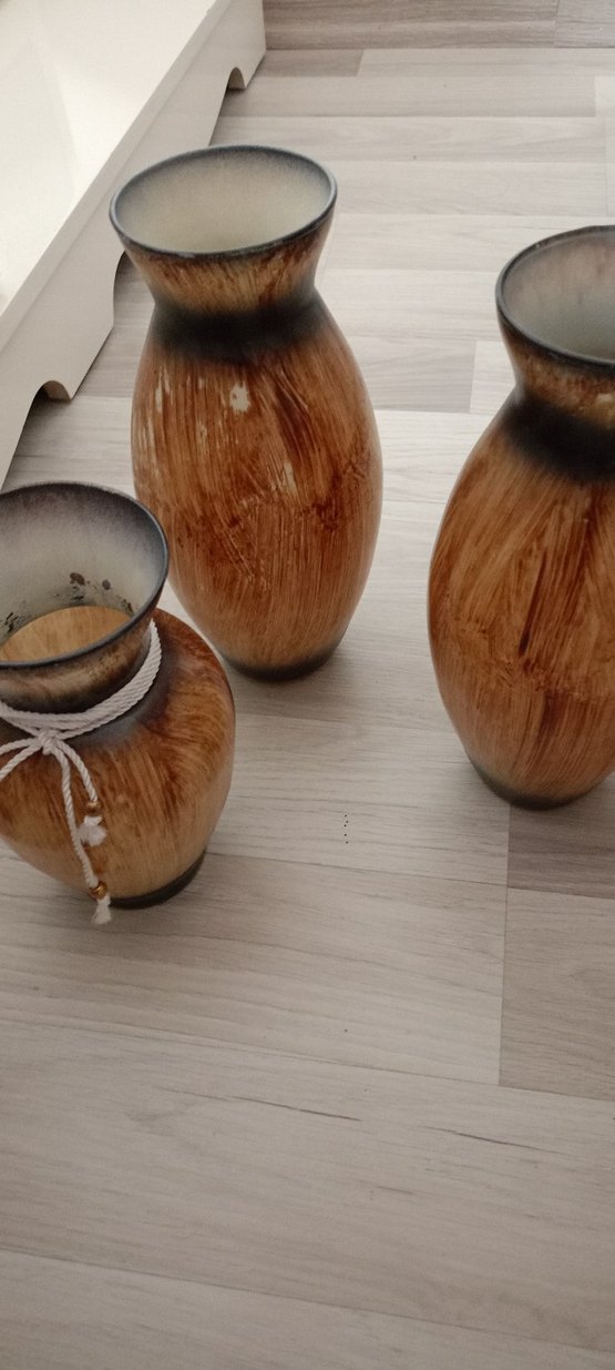 Bej ve gri tonlarda, doğal görünümlü seramik vazo seti. Birinde dekoratif ip detayı bulunur.