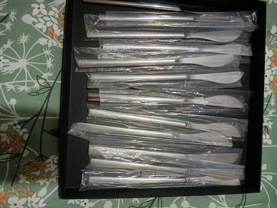 Bej ve gri tonlarda, hijyenik şekilde tek tek paketlenmiş bıçak seti. Yemek için çeşitli gereçler içerir. 12 adet paketinde açılmamış büyük ağır kaliteli ve hiç kullanılmamış sıfır yemek bıçak seti..marka Pm Leonardo