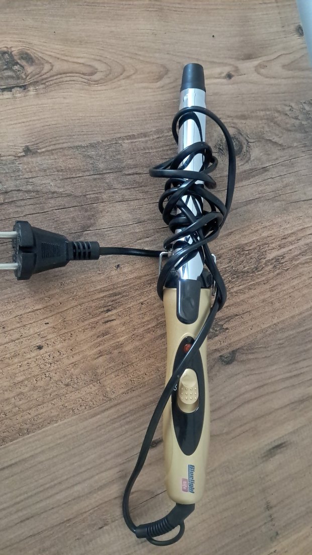 Bej ve gri renkte, açma-kapama düğmeli saç maşasıdır. Saçları şekillendirmek için uygundur.