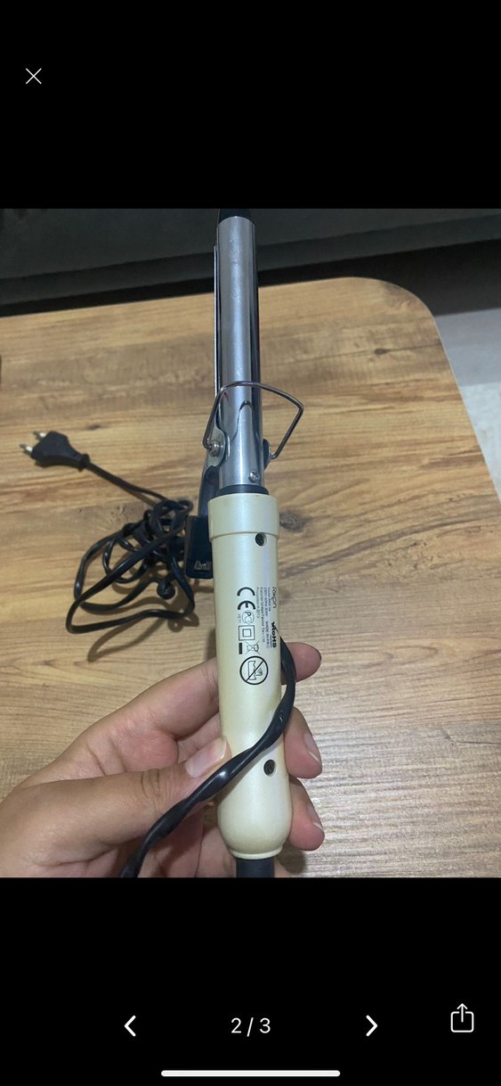 Bej ve gri renklerde, metal varilli ve kablolu saç maşası, saç şekillendirmek için kullanılır.