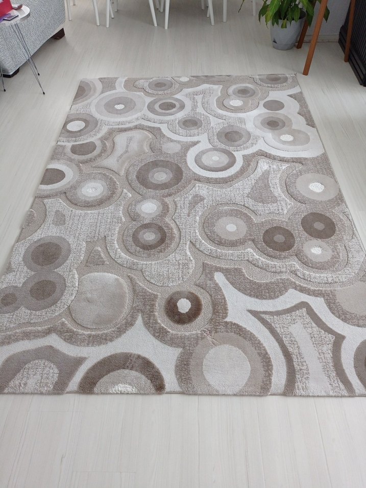 Bej ve gri tonlarında soyut desenli bu modern halı, her odaya zarif bir dokunuş katar. en 157 boy 230 cm