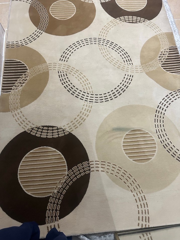 Bu çağdaş halı, bej ve gri tonlarda soyut bir desen sunar. Farklı dokularda dairesel şekiller içerir. 4 metrekaredir halı kir lekesi vardır yıkayınca çıkar fotoğrafta belirtilmiştir kaşmir mağazasında alınmıştır