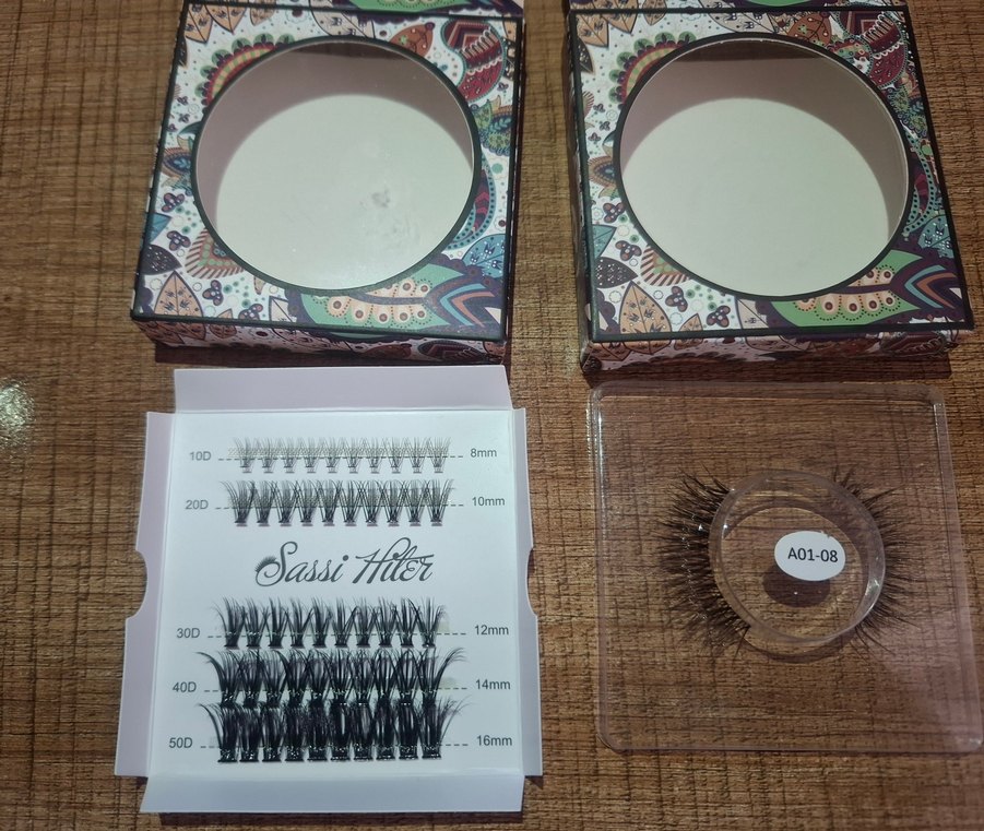 8mm'den 16mm'ye değişen uzunluklarda bej ve gri takma kirpik seti. Bireysel demetler ve A01-08 etiketli tam şerit içerir.