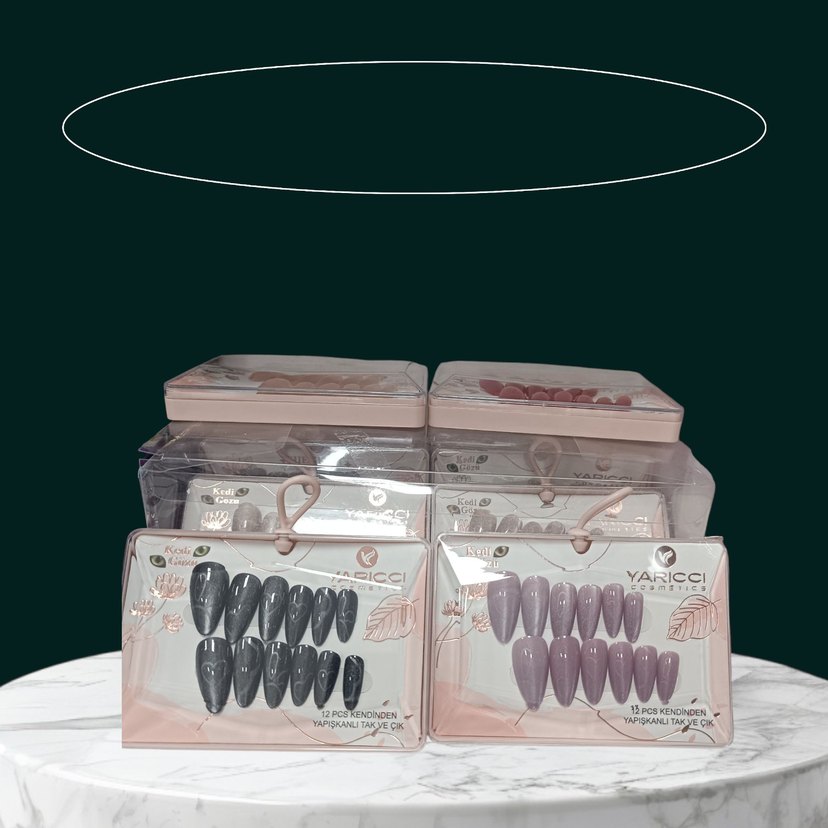 Bej ve gri tonlarında, kendinden yapışkanlı takma tırnak setleri. Her set farklı boylarda 12-13 tırnak içerir.